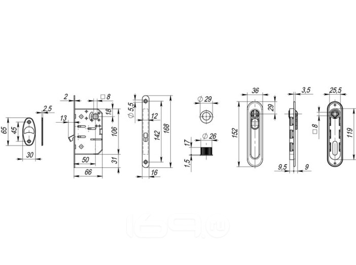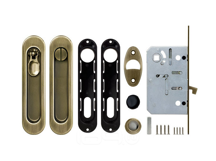 Комплектация:Ручки для раздвижных дверей, Пластиковый вкладыш, Торцевой захват, Защелка для раздвижных дверей, Ответная планка, Крепежный комплект, Шаблон для монтажа.
