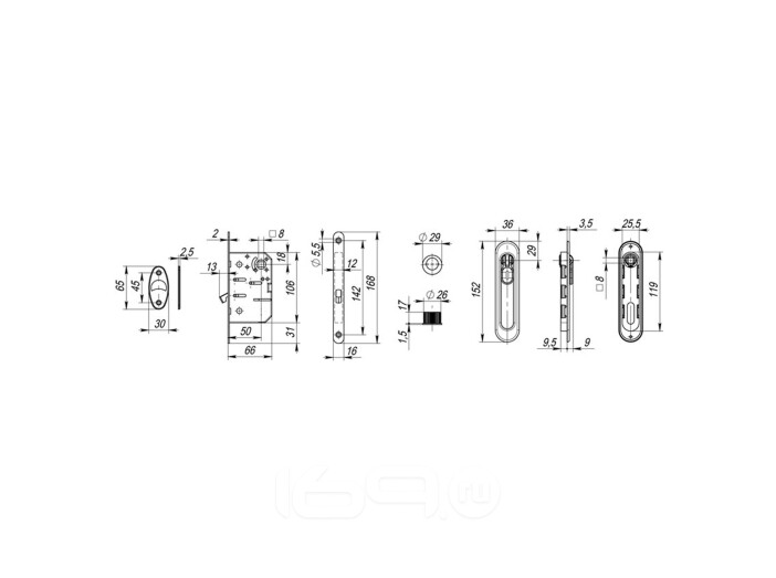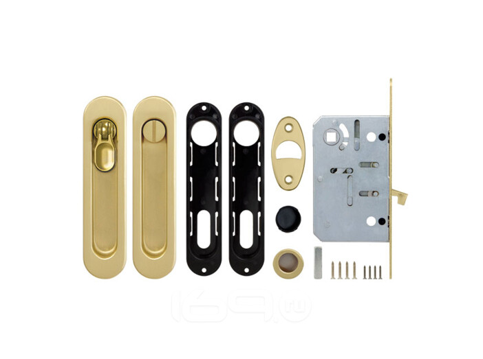 Комплектация:Ручки для раздвижных дверей, Пластиковый вкладыш, Торцевой захват, Защелка для раздвижных дверей, Ответная планка, Крепежный комплект, Шаблон для монтажа.