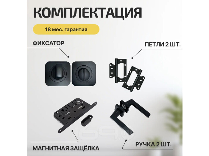 Комплектация:Ручка на квадратной розетке VANTAGE V07BL AL черный (1 шт) + Фиксатор на квадратной розетке Vantage BK02BL-2 черный ( 1 шт) + Защелка магнитная под фиксатор Vantage MC96 BL черный ( 1 шт) + Петля универсальная без врезки IN4200W BL (200-2B 100x2,5) черный ( 2 шт)