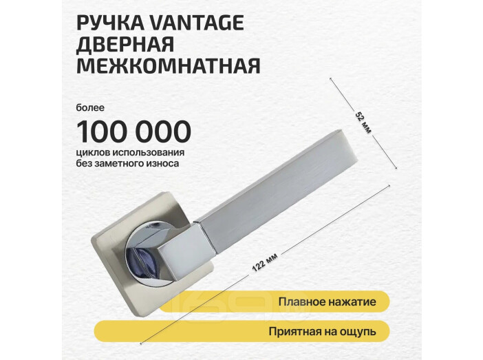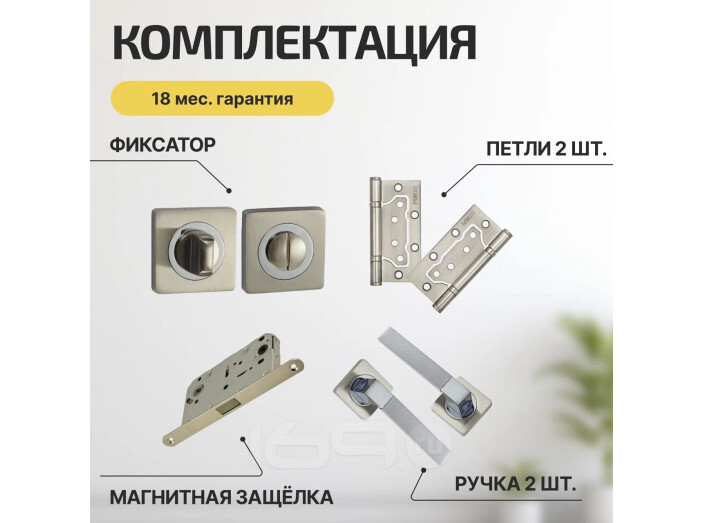 Комплектация:Ручка на квадратной розетке VANTAGE V07D AL матовый никель ( 1 шт) + Фиксатор на квадратной розетке Vantage BK02D матовый никель ( 1 шт) + Защелка магнитная под фиксатор Vantage MC96 SN матовый никель ( 1 шт) + Петля универсальная без врезки IN4200W PN (200-2B 100x2,5) мат. никель (2 шт)