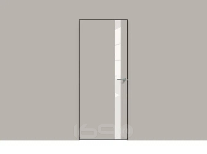 Дверь межкомнатная Concept-702 ПВХ, Шелл грей, остекленная, лакобель белый, кромка алюминиевая черная матовая, каркасно-щитовая