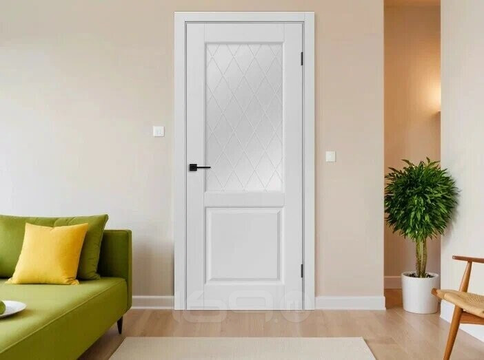 Дверь межкомнатная Челси 02 Эмаль, Белый, остекленная, сатинат белый с фотопечатью, каркасно-щитовая