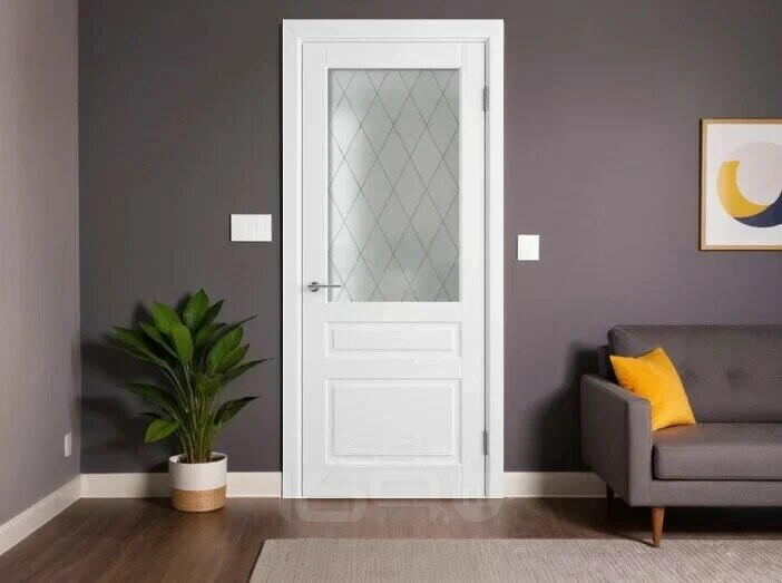Дверь межкомнатная Челси 04 Эмаль Белый, остекленная, сатинат белый с фотопечатью, каркасно-щитовая