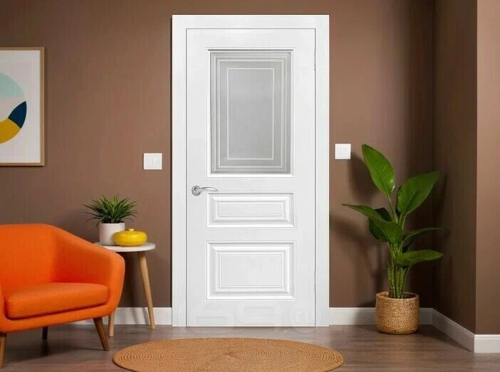 Дверь межкомнатная Роял-3 Эмаль Белый, остекленная, сатинат белый с фотопечатью, кромка нет, каркасно-щитовая