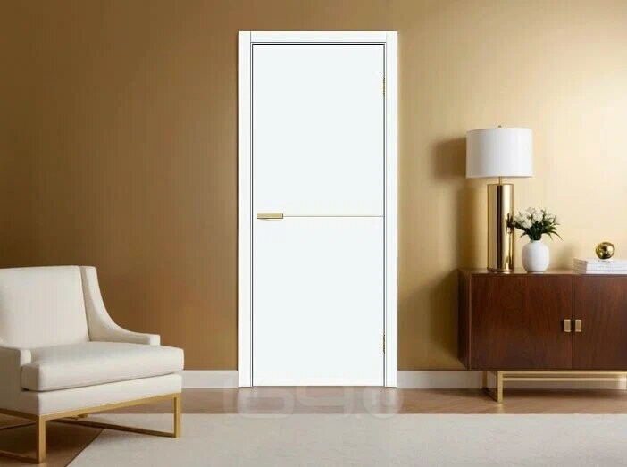 Дверь межкомнатная Браво-0.21.П (SG:P3) ПЭТ White Silk, глухая, декор sgold, кромка обычная, каркасно-щитовая