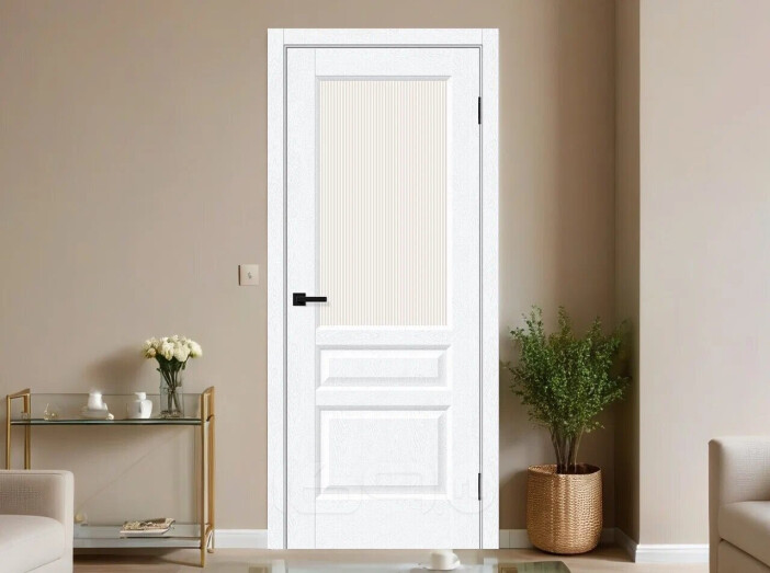 Дверь межкомнатная Неоклассик-35 ПЭТ White Silkwood, остекленная, рифлёное стекло magic moru, кромка нет, царговая