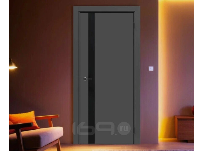 Щитовая дверь высокой прочности, которую обеспечивает жесткий тамбурат с малым размером ячейки и плита HDF (на 33% толще обычной). Используем PUR-клея необратимой полимеризации. По периметру двери установлена алюминиевая кромка чёрного цвета. Дверь укомплектована черным окрашенным стеклом лакобель - Black Star