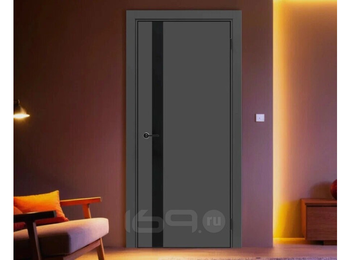Щитовая дверь высокой прочности, которую обеспечивает жесткий тамбурат с малым размером ячейки и плита HDF (на 33% толще обычной). Используем PUR-клея необратимой полимеризации. По периметру двери установлена алюминиевая кромка чёрного цвета. Дверь укомплектована черным окрашенным стеклом лакобель - Black Star