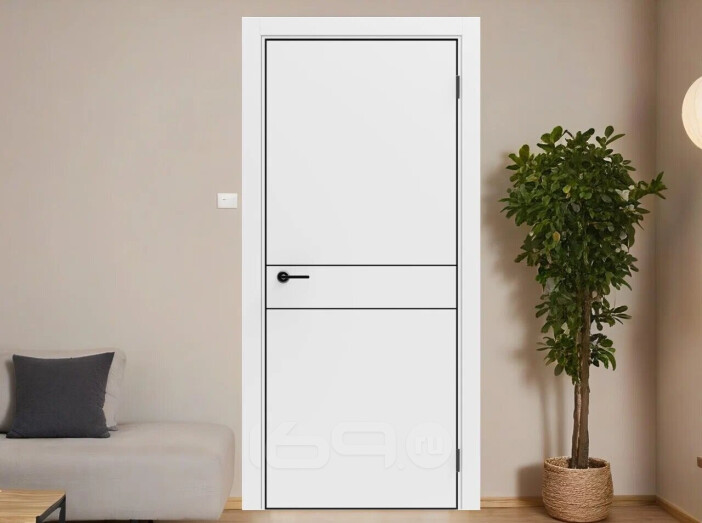 Дверь межкомнатная Порта-52 4AB ПЭТ Shellac White, глухая, кромка алюминиевая черная матовая, каркасно-щитовая