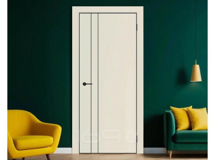 Дверь межкомнатная Порта-58 4AB ПЭТ Shellac Cream, глухая, декор black star, кромка алюминиевая черная матовая, каркасно-щитовая
