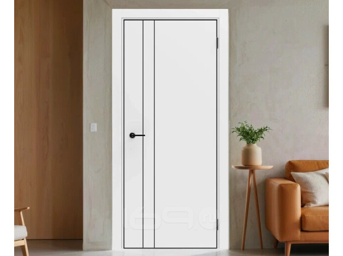 Дверь межкомнатная Порта-58 4AB ПЭТ Shellac White, глухая, декор black star, кромка алюминиевая черная матовая, каркасно-щитовая