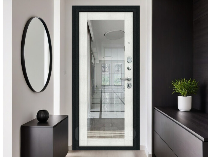 Дверь входная Флэш 119.Б15 Букле черное/Bianco Veralinga, с зеркалом, 2 замка, с ночной задвижкой