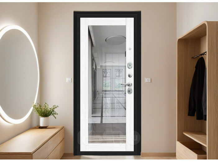 Дверь входная Флэш Букле черное/Snow Melinga, с зеркалом, 2 замка, с ночной задвижкой 205x86 Правое