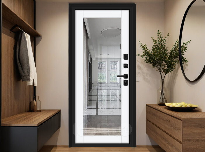 Дверь входная Флэт/SBlack Black Shell/White Silk, с зеркалом, 2 замка, с ночной задвижкой