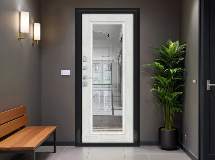 Дверь входная Форм/BChrome Almon/Bianco Melinga, с зеркалом, 2 замка, с ночной задвижкой