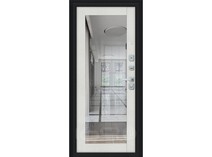 Дверь входная Флэш МФ/BChrome Букле черное/Bianco Melinga, с зеркалом, 2 замка, с ночной задвижкой 205x86 Правое