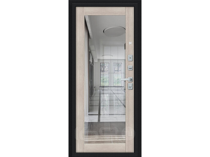 Дверь входная Флэш МФ/BChrome Букле черное/Cappuccino Melinga, с зеркалом, 2 замка, с ночной задвижкой
