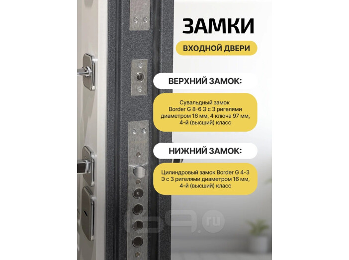 Верхний замок:Сувальдный замок Border G 8-6 Э с 3 ригелями диаметром 16 мм, 4 ключа 97 мм, 4-й (высший) класс