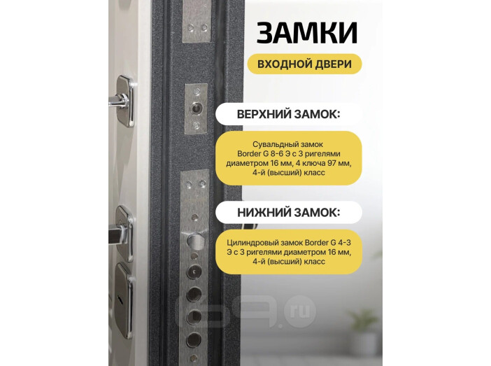 Верхний замок:Сувальдный замок Border G 8-6 Э с 3 ригелями диаметром 16 мм, 4 ключа 97 мм, 4-й (высший) класс
