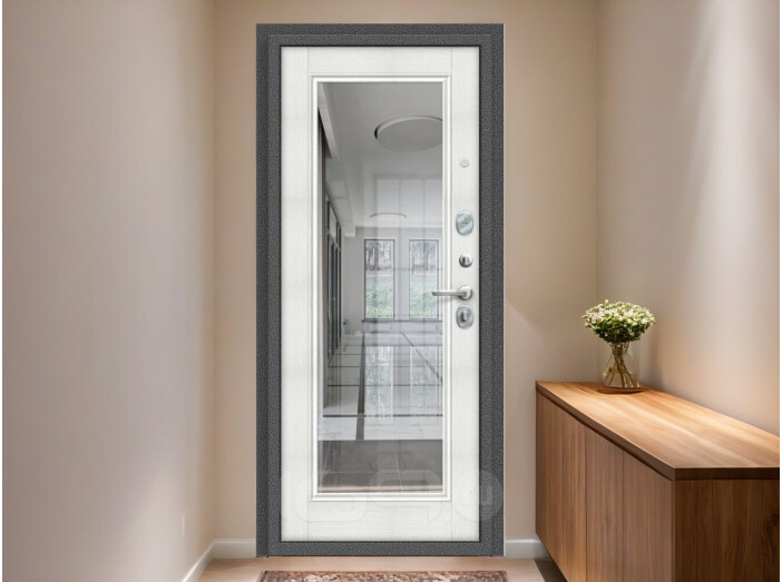 Дверь входная Porta R-2 104/П61 Антик серебро/Bianco Veralinga, с зеркалом, 2 замка, с ночной задвижкой