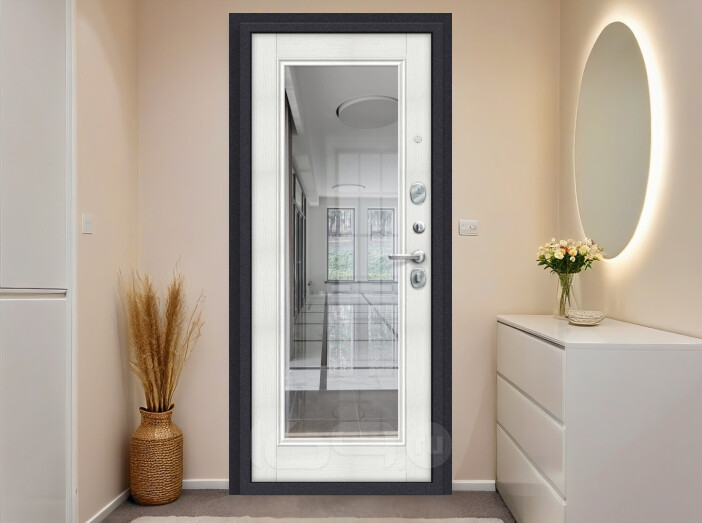 Дверь входная Porta R-3 4/П61 Graphite Pro/Bianco Veralinga, с зеркалом, 2 замка, с ночной задвижкой