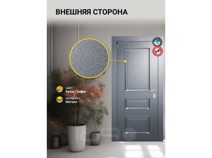 Утепление:9 слоёв термоизоляции PIR; двойная пробковая термоизоляция 2х4 мм на полотне; двойная пробковая термоизоляция 2х4 мм на коробке; 5 контуров высококачественного EPDM-уплотнителя (Швеция) + демпферная лента; паропроницаемая саморасширяющаяся уплотнительная лента ПСУЛ в дверной коробке; минеральная вата Технониколь внутри рёбер жёсткости; фольгированный вспененный полиэтилен 5 мм в замковой части.