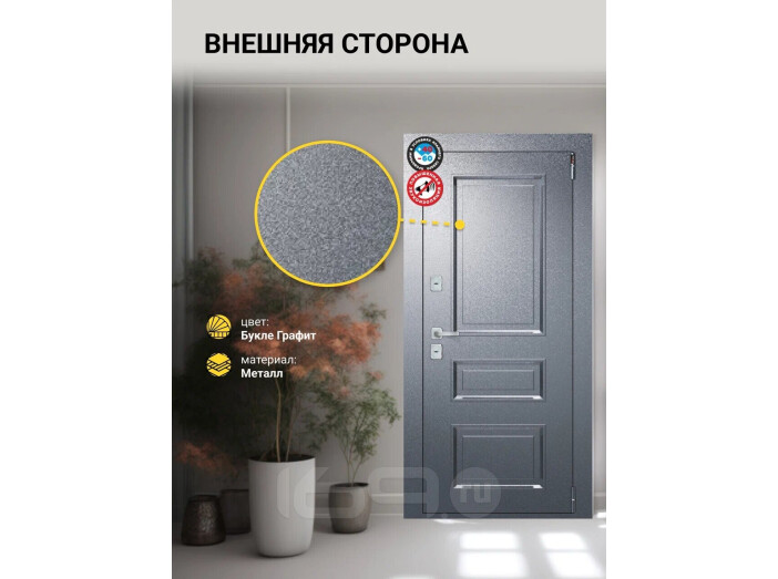 Утепление:9 слоёв термоизоляции PIR; двойная пробковая термоизоляция 2х4 мм на полотне; двойная пробковая термоизоляция 2х4 мм на коробке; 5 контуров высококачественного EPDM-уплотнителя (Швеция) + демпферная лента; паропроницаемая саморасширяющаяся уплотнительная лента ПСУЛ в дверной коробке; минеральная вата Технониколь внутри рёбер жёсткости; фольгированный вспененный полиэтилен 5 мм в замковой части.