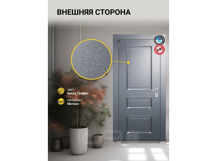 Утепление:9 слоёв термоизоляции PIR; двойная пробковая термоизоляция 2х4 мм на полотне; двойная пробковая термоизоляция 2х4 мм на коробке; 5 контуров высококачественного EPDM-уплотнителя (Швеция) + демпферная лента; паропроницаемая саморасширяющаяся уплотнительная лента ПСУЛ в дверной коробке; минеральная вата Технониколь внутри рёбер жёсткости; фольгированный вспененный полиэтилен 5 мм в замковой части.