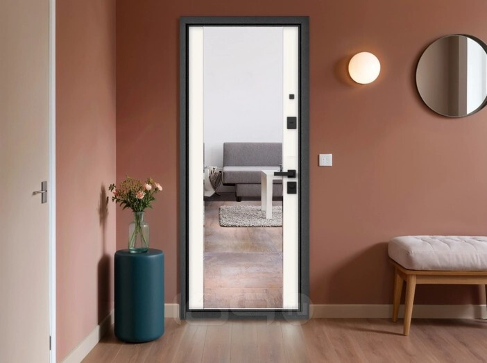 Дверь входная City Max PP 182/164 (чёрная фурнитура) Белый софт/Белый софт, с зеркалом, 2 замка, с ночной задвижкой 205x96 Правое